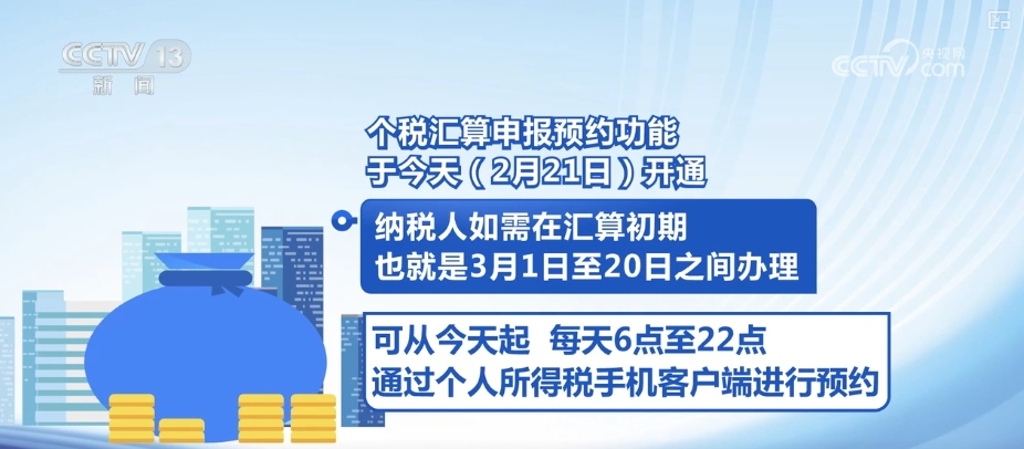 央视网消息:记者从国家税务总局了解到,2024年度个税汇算将于3月1日—6月30日进行,申报预约功能于2月21日开通。纳税人如需在汇算初期,也就是3月1日至20日之间办理,可从2月21日起,每天6点至22点,通过个人所得税手机客户端进行预约。3月21日至6月30日,纳税人无需预约,可随时办理。