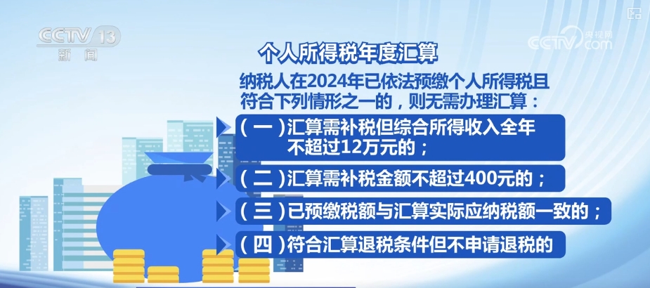 纳税人在2024年已依法预缴个人所得税且符合下列情形之一的,则无需办理汇算:(一)汇算需补税但综合所得收入全年不超过12万元的;(二)汇算需补税金额不超过400元的;(三)已预缴税额与汇算实际应纳税额一致的;(四)符合汇算退税条件但不申请退税的。