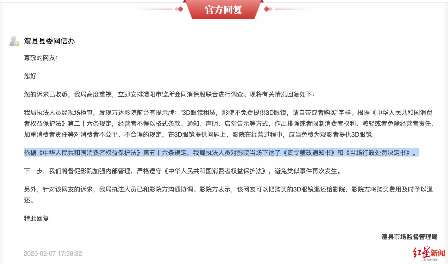相关回复显示,根据《中华人民共和国消费者权益保护法》第五十六条规定,澧县市场监管局执法人员对澧县万达影城当场下达了《责令整改通知书》和《当场行政处罚决定书》。