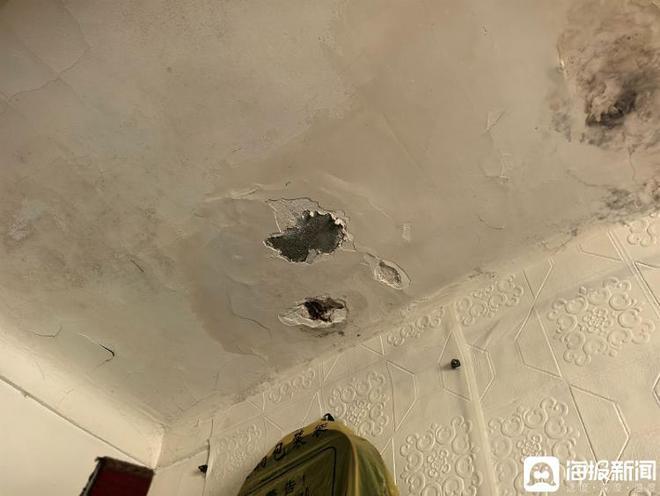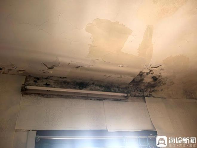 刘伯伯告诉记者,由于房子年岁太久,自己住的房间天花板也有破损现象,内部水泥层已经裸露,还有一处墙面已经渗水变黑。
