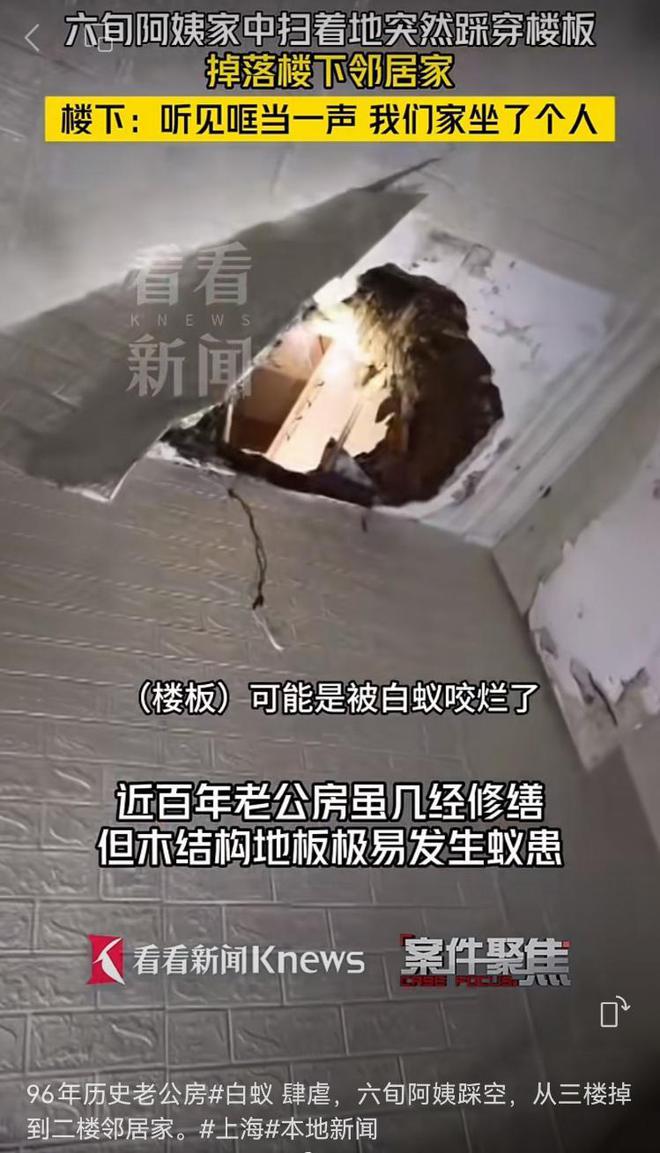 近日,上海万航渡路中行小区62号的陈女士在家中打扫卫生时,竟突然踩穿楼板,掉到楼下邻居家中。事后,中行小区物业经理在采访中表示,楼板断开的主要原因可能是承重梁被白蚂蚁蛀掉了。2月20日,海报新闻记者来到中行小区,有住户反映,为了防范白蚁,每到黄梅天气,自己连门窗都不敢开。
