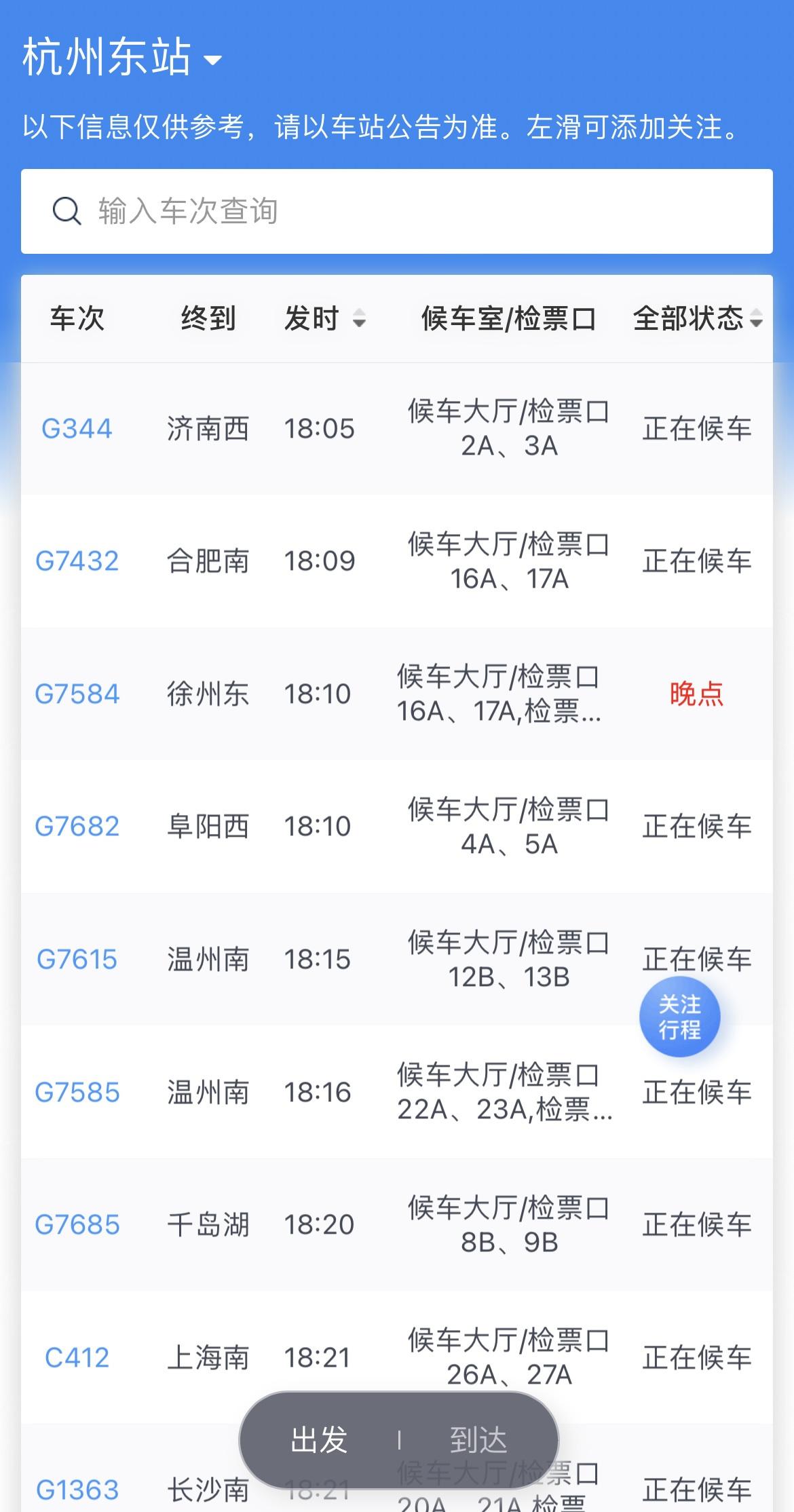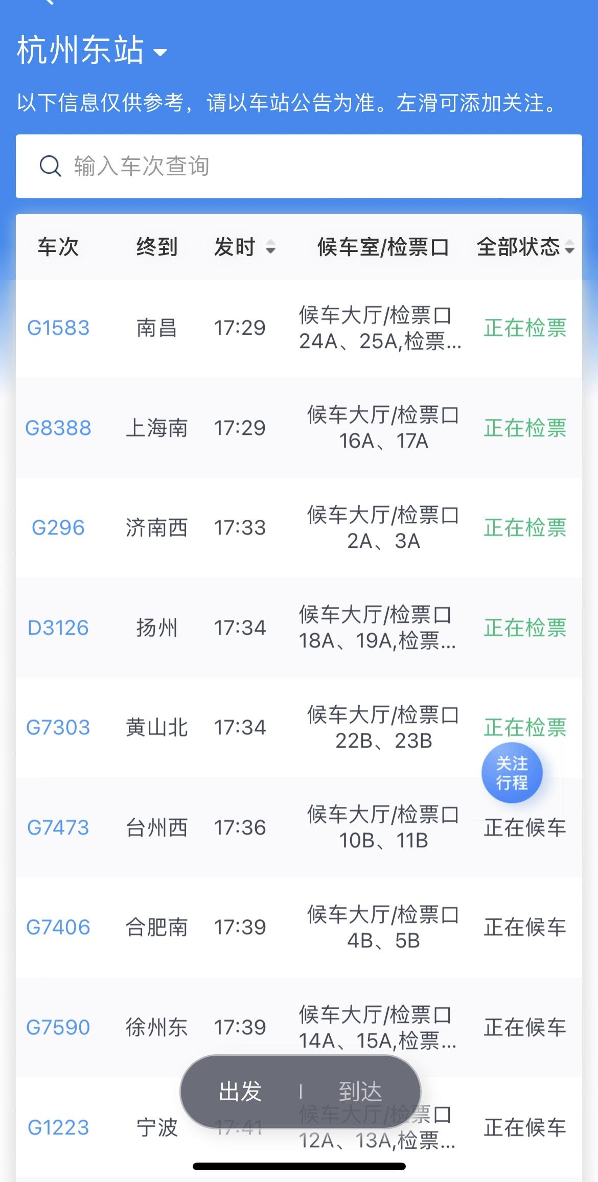 下午5点30分,记者查询铁路12306APP注意到,杭州东站大部分列车显示正在检票或正在候车,仅个别车次显示“晚点”。