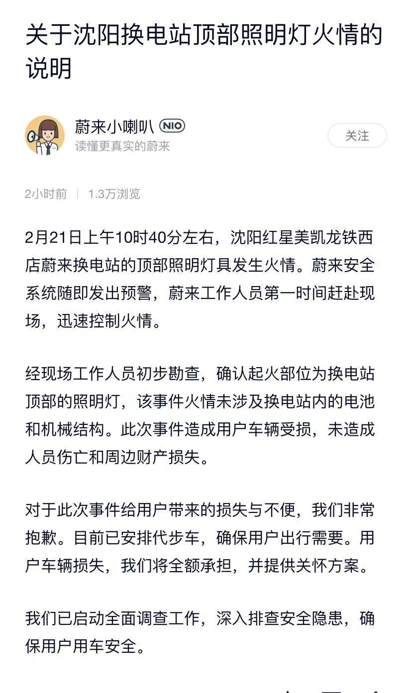 现代快报讯(记者宋体佳)2月21日,有网友爆料,沈阳一蔚来汽车换电站突然起火。现代快报记者注意到,当天,蔚来汽车官方账号“蔚来小喇叭”对此事做出回应:起火位置为换电站顶部的照明灯,有车辆受损,但并未造成人员伤亡和周边财产损失。并称将全额承担用户损失。