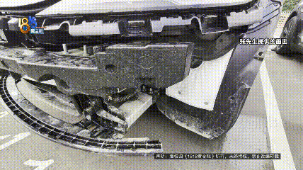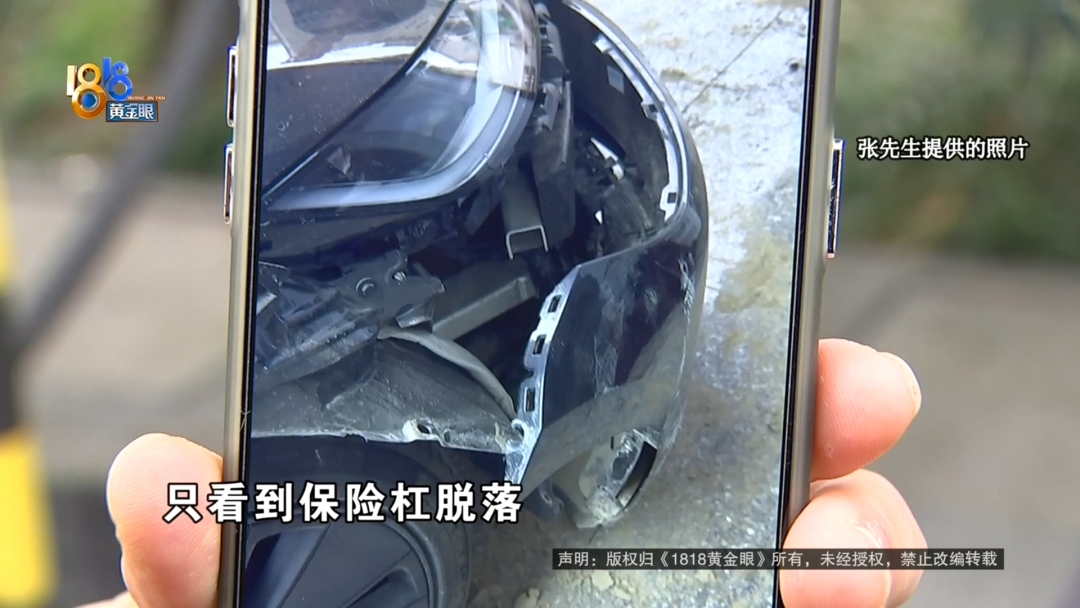 这是张先生赶到现场后拍摄的视频,车子前保险杠的右侧已经脱落。