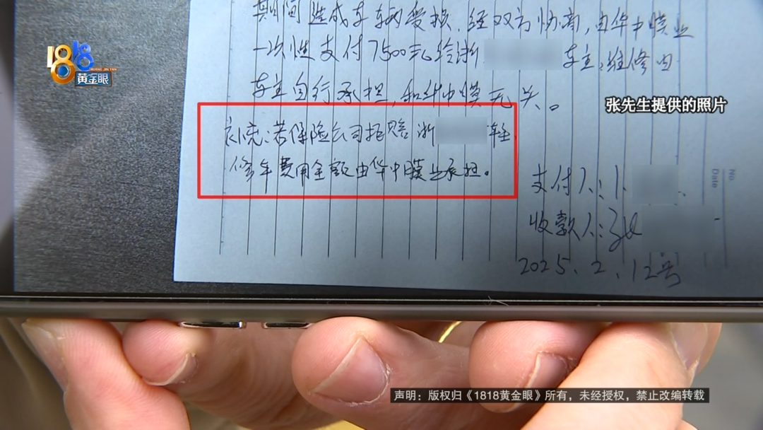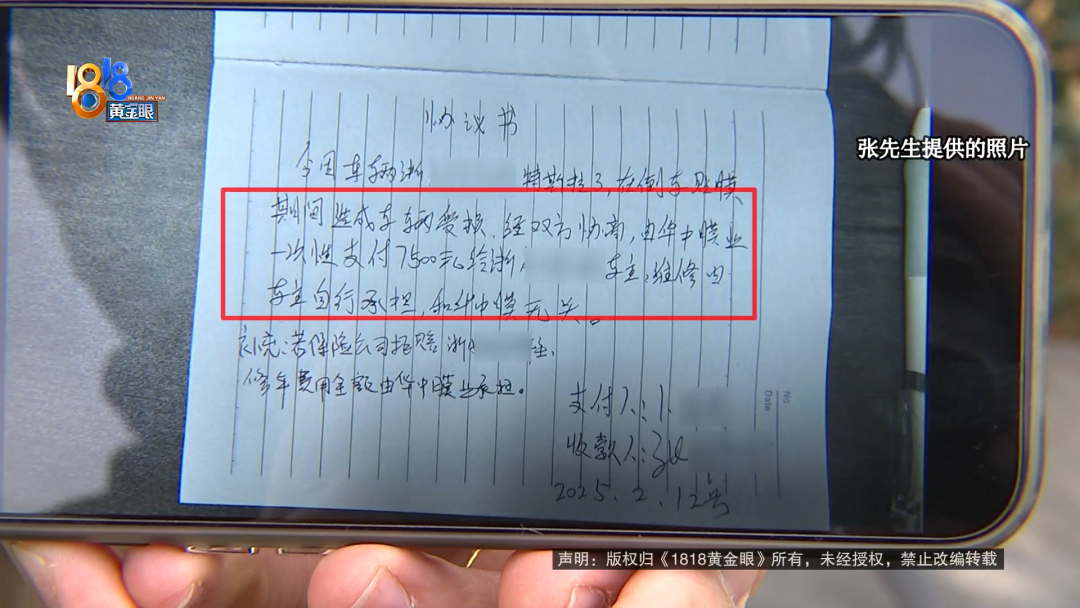 照片里这份协议是2月12号签的,其中提到华中膜业一次性支付7500元给张先生,维修费由张先生自行承担,微信聊天记录显示,当天下午3点多,华中膜业杭州区域负责人卜总给张先生转了七千五。