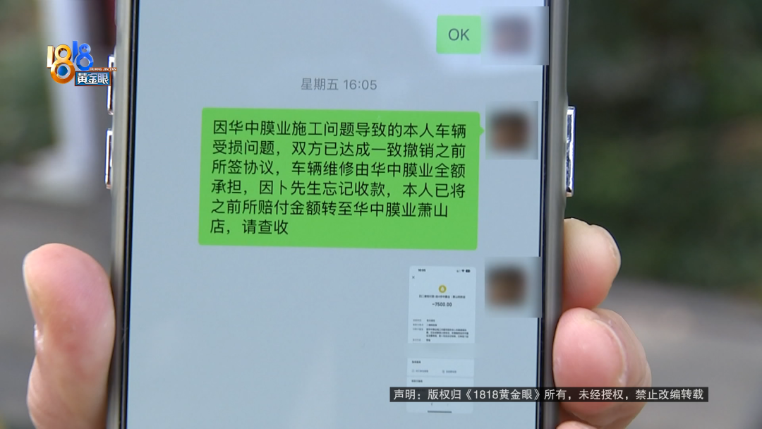华中膜业杭州区域负责人 卜总:本来这个钱一次性付清,也不管赔偿多少钱,我们店里省得麻烦。第二天他又说不想要这个钱,想去修。公司考虑还是以顾客为主,多个三千两千都无所谓了,一定损,两万多。我就上报公司,公司说太多了,接受不了。(七千五)这个钱,他随时要都可以给他。因为他扫码转过来,公司怎么给他?公司也没有他的账号 。