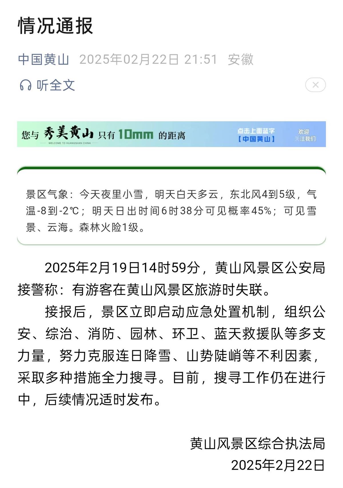 2月22日晚,“中国黄山”官方微信公众号发布情况通报,2025年2月19日14时59分,黄山风景区公安局接警称:有游客在黄山风景区旅游时失联。