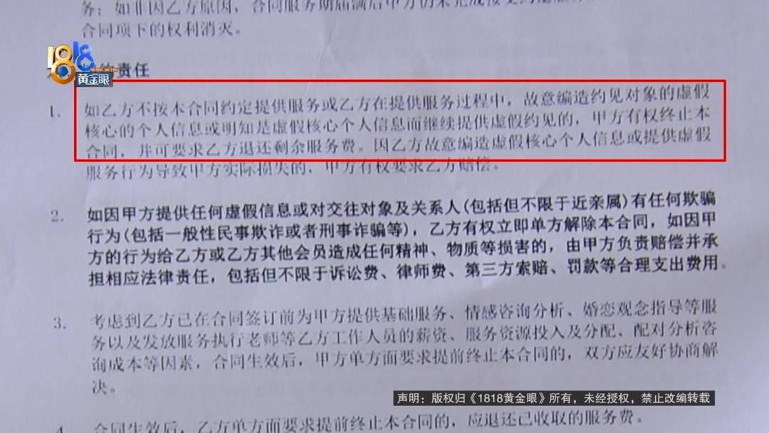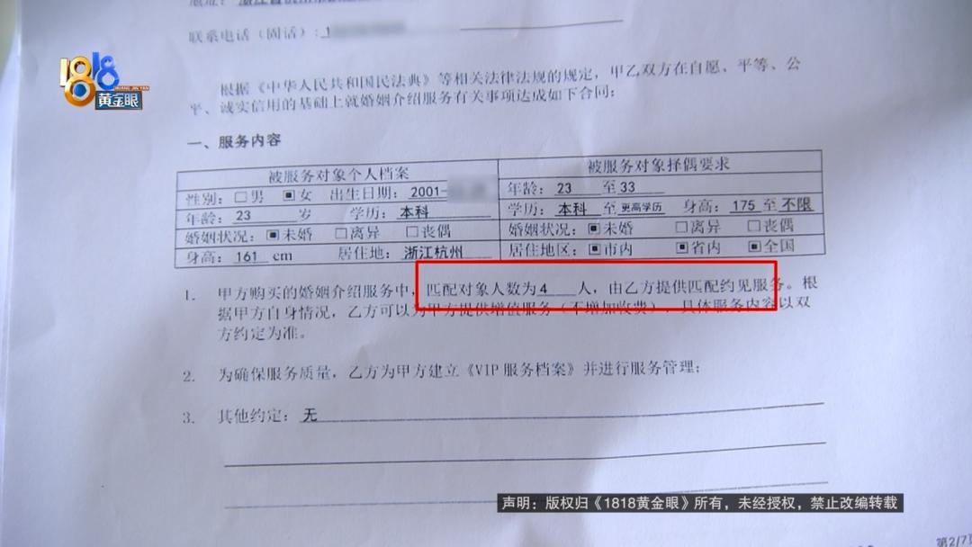 小夏:合同上面写的是匹配但当时没有细看,因为他给我解释说的是匹配是谈4个对象,就是说你谈成功,谈一个了给你扣掉1,没谈成功还可以再找他们,他们还会继续给你介绍,意思有点像是终身的。他说那个时间和个数只是为了应付他们的考核,不然我是不可能两万块钱只去买4个人见面机会。