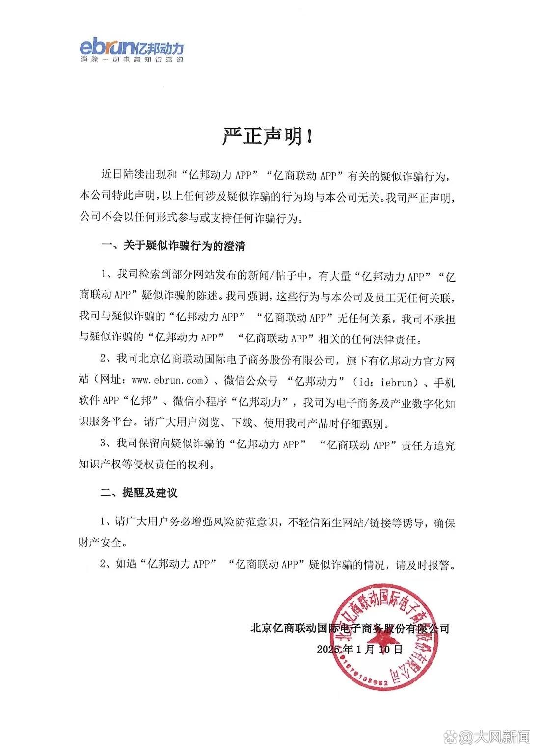 此外,北京亿商联动国际电子商务有限公司也对外发布公告。近日,陆续出现与“亿邦动力App”“亿商联动App”有关的疑似诈骗行为,该公司特此声明,以上任何涉及疑似诈骗的行为均与公司无关。公司严正声明,不会以任何形式参与或支持任何诈骗行为。