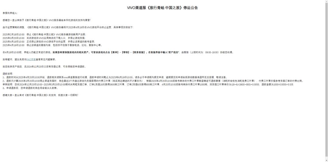 官方宣布,由于运营策略调整,《旅行青蛙·中国之旅》VIVO服务器将在4月19日终止运营,玩家可申请退款。