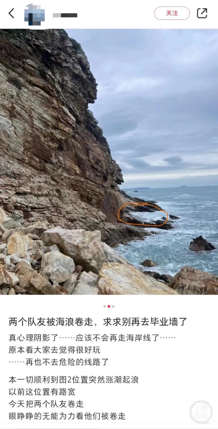 在该网帖的评论区,一名网友称,事发时自己正在附近放飞无人机。他晒出的截图显示,当时海边有两名落水者, 附近一艘快艇正在向他们靠近,试图进行营救。记者尝试联系该网友,但未获回应。评论区不少网友证实,牛奶排附近的确非常危险。“这里一定要注意潮位,有浪的时候会打湿必经之路的石头,上面巨滑,穿什么鞋都没用”“遇到险情一定要尽快原路返回,不要冒险”“对大自然必须要有敬畏之心”……
