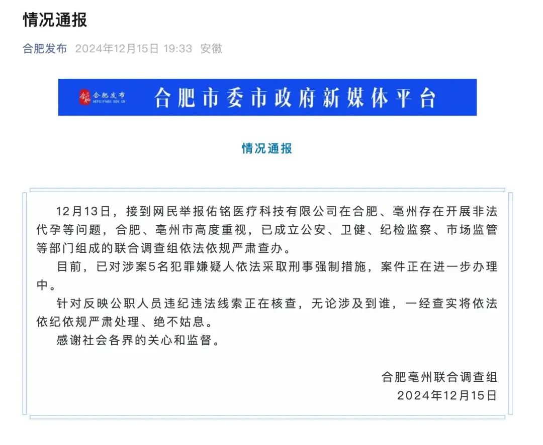 同日,合肥肥东县新闻办发布情况通报:网传安徽佑铭医疗科技有限公司来我县从事代孕一事,县卫健委立即会同公安、市场监管等部门现场调查核实相关情况,依法查扣有关设备器具,并传唤该公司负责人。一经查实,将依法依规严肃处理。