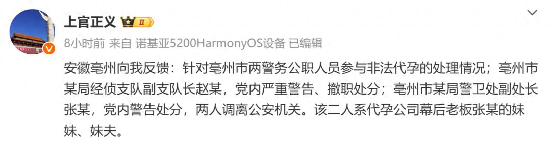2月25日,打拐志愿者上官正义通过个人微博发文称,他收到举报安徽亳州警务人员参与非法代孕的处理情况。