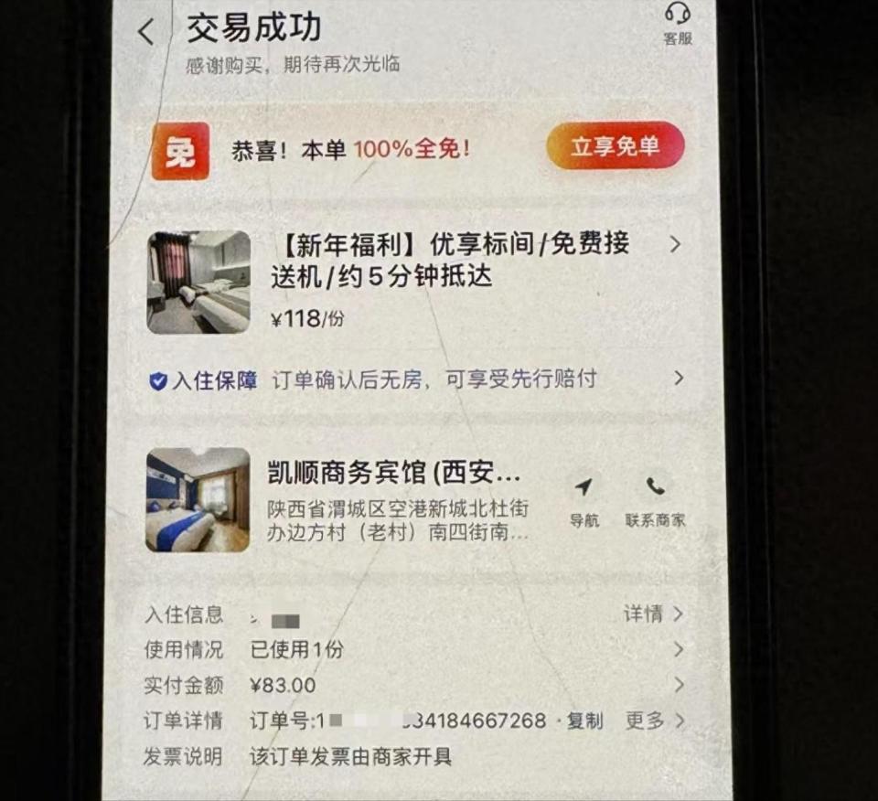 “前段时间,我在抖音上刷到凯顺商务宾馆(西安咸阳国际机场店)的直播,因为离机场不远,也有接机服务,于是我在这家酒店预订了一晚标间,打算回家中转时入住。”梁女士说,“因为我们一共3个人,我特意在直播间里询问店家3人是否能入住标间,她说可以,我才下了单,花了83元。”