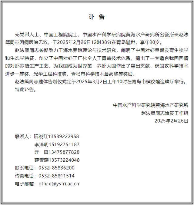 2月26日,中国水产科学研究院黄海水产研究所发布讣告,无党派人士、中国工程院院士、中国水产科学研究院黄海水产研究所名誉所长赵法箴同志因病医治无效,于2025年2月26日12时38分在青岛逝世,享年90岁。