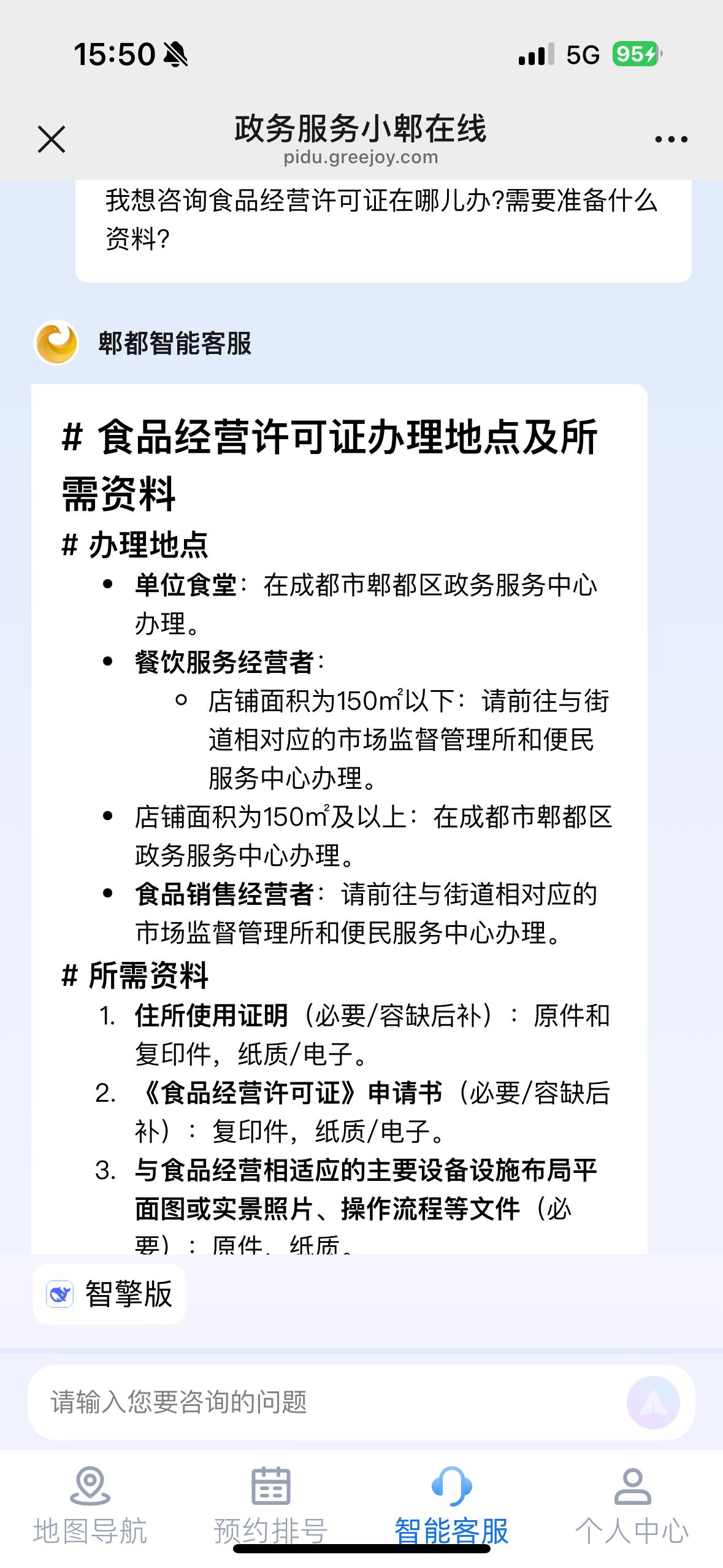 AI智能客服是否能为市民提供实际性便利?今日,红星新闻记者来到郫都区政务服务中心,现场体验了“AI公务员”的办事效率。在政务服务中心的自助服务终端输入“食品经营许可证办理地点及所需资料有哪些?”,不到十秒,“AI公务员”已经列明了不同类型食品经营许可证的不同办理地点、流程及所需材料。