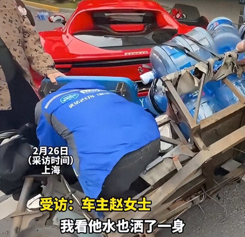 大红色法拉利轿车被一送水大叔骑的三轮板车追尾受损,豪车车主不仅没有索赔,反而在看到送水大叔没事后直接让其离开了。2月26日,网上一段视频令众多网友点赞。