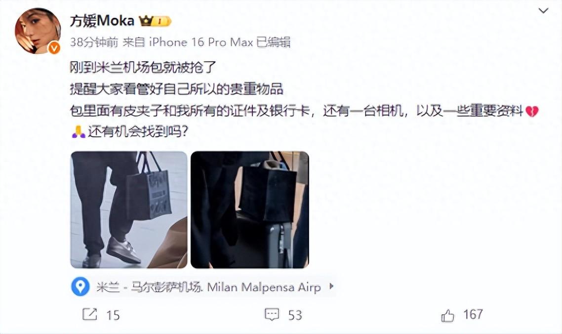 2月26日,郭富城的妻子方媛发布微博,表示:“刚到米兰包被抢了,提醒大家看管好自己的所有贵重物品,包里面有皮夹子和我所有的证件及银行卡,还有一台相机,以及一些重要资料。还有机会找到吗?”