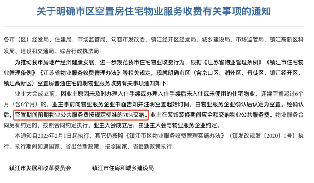 以江苏省为例,不止句容市,镇江市也于2024年底发布《关于明确市区空置房住宅物业服务收费有关事项的通知》,提到自2月1日起,镇江市区住宅连续空置6个月以上的,物业费最多交纳70%。