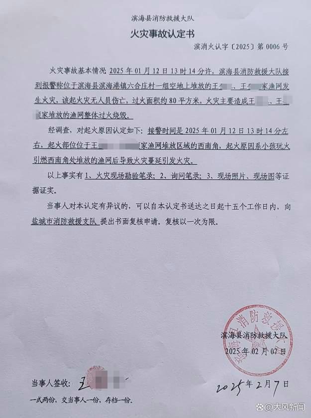 滨海县消防救援大队2月7日出具《火灾事故认定书》显示,1月12日13点14分许接到报警。该起火灾无人员伤亡,过火面积约80㎡,造成两户人家堆放的渔网整体过火烧毁,起火原因是小孩玩火引燃。
