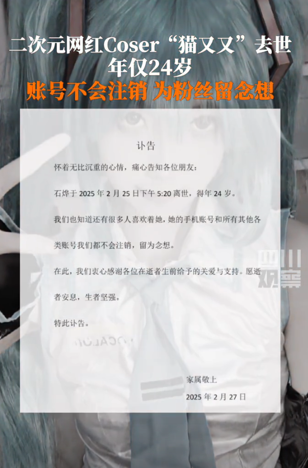 在猫又又的账号上发布讣告,称“猫又又”于2025年2月25日下午5点20分因病离世,年仅24岁。