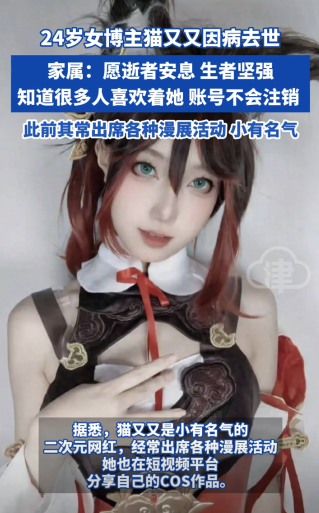 “我们也知道还有很多人喜欢看她,她的手机账号和所有其他各类账号都不会注销,留为念想。”据悉,“猫又又”是小有名气的二次元网红,经常出席各种漫展活动,也在短视频平台分享自己的cos作品。