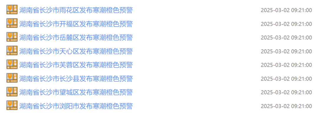 长沙市气象台3月2日9时21分发布寒潮橙色预警信号:预计湘江新区、雨花区、天心区、芙蓉区、开福区、长沙县、望城区、浏阳市、宁乡市未来48小时气温降幅将达12℃以上,最低气温降至4℃以下,并伴有大风发生,请加强防范。