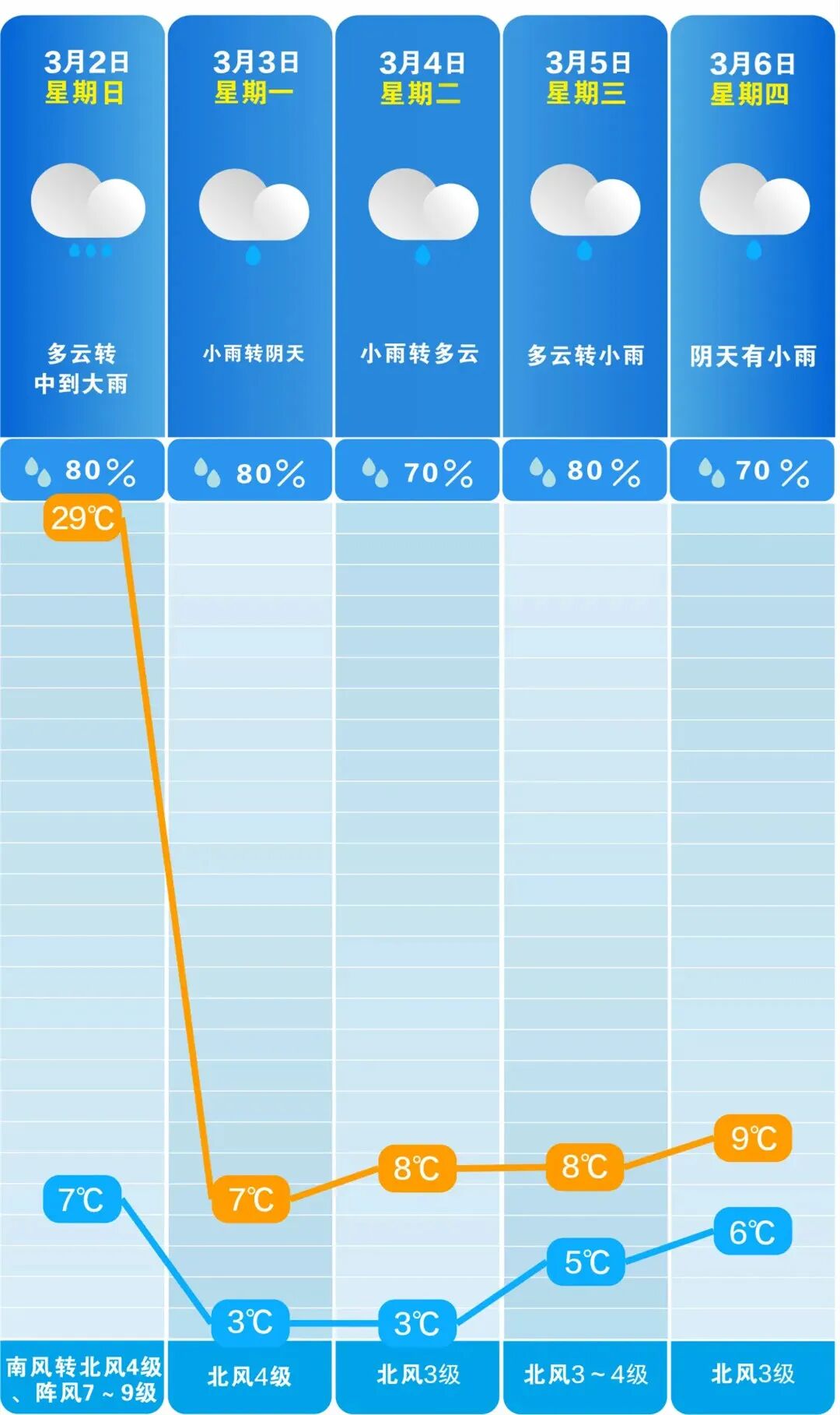 具体来看,3月2日,长沙多云转中到大雨,下午到夜间部分地区有雷暴大风、冰雹,南风转北风4级、阵风7到9级,7℃至29℃;3日,长沙小雨转阴天,北风3到4级,3℃至7℃;4日,长沙多云,北风3级,3℃至8℃。