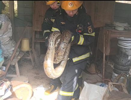 消防员到场后经确认,这是一条缅甸蟒蛇,预估长度达3米长,体重超50斤。