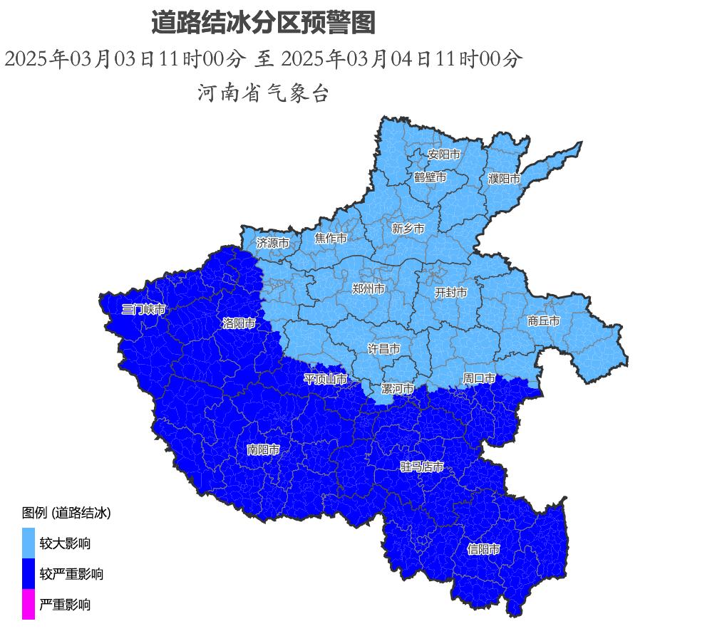 河南全省路表温度低于0℃,将出现对交通有较大影响的道路结冰,其中三门峡、洛阳中南部、平顶山南部、漯河南部、周口南部、南阳、驻马店、信阳将出现对交通有较严重影响或严重影响的道路结冰。请注意防范。上述地区的相邻县(市、区)也需关注。