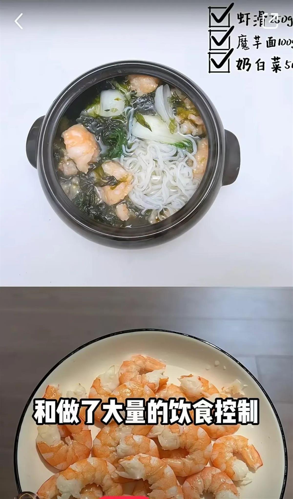 减肥,不仅要进行规律的锻炼,还需要严格控制饮食。在她的视频中,她分享过水煮虾、魔芋面、白菜等减肥食谱。