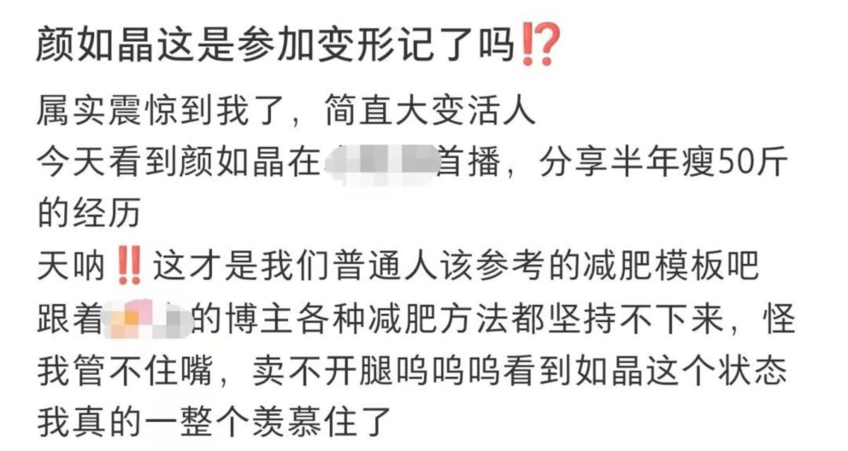 数月前,颜如晶半年瘦了50斤的消息曾冲上热搜。她在个人社交平台晒出了减肥成果视频,并配文:报告报告!已瘦50斤!