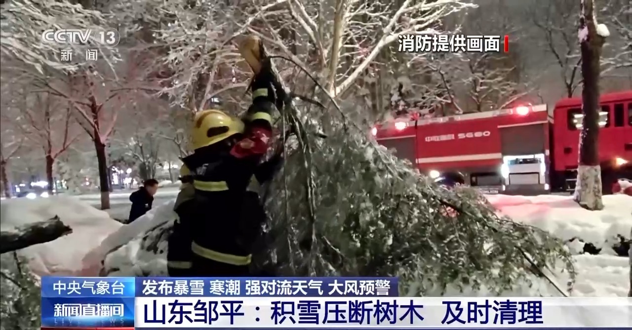 3月2日,滨州邹平市出现暴雪天气,一辆轿车被积雪压断的树木砸到,需要帮助,所幸车内无人。消防人员立即使用斧头等工具对树枝、树干进行切割,合力将树枝从车上抬走。随后,对旁边其他有隐患的树枝进行清理,确保群众出行安全。