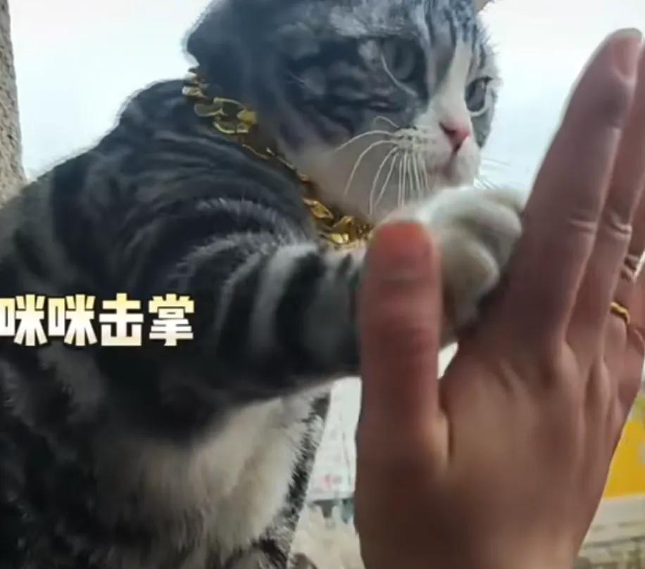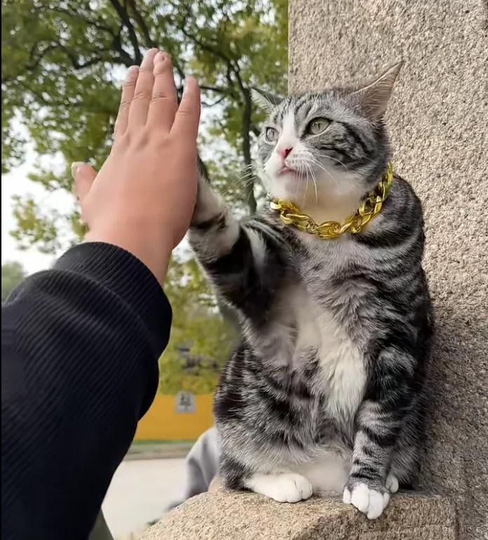 近日,苏州西园寺,一只爱和游客击掌的小猫火爆网络,这只猫戴着金链子,游客伸手它就会举爪子回应,有爱的互动萌到了很多游客和网友。