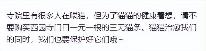 同时,西园寺工作人员还提醒游客,别在寺庙附近的商店买猫条,很多都是三无产品,质量很差。据悉,去年夏天寺内好多猫因为被投喂劣质猫条生病,死了好几只。