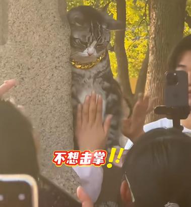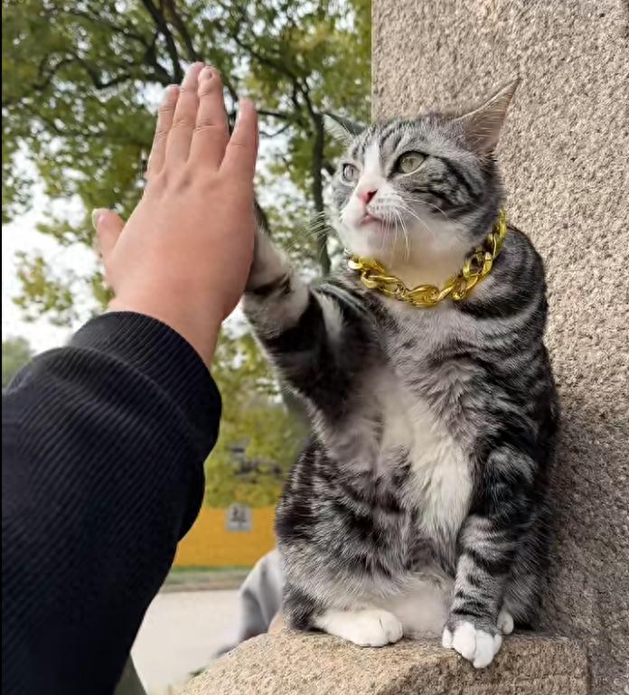近日,苏州西园寺。一只爱和游客击掌的小猫火爆网络,这只猫戴着金链子,游客伸手它就会举爪子回应,有爱的互动萌到了很多游客和网友。