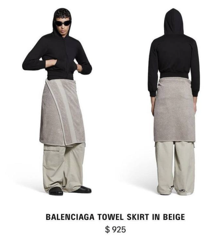 巴黎世家春季24系列广告大片中的一款Towel半身裙,因形似浴巾引发热议。线上售价为925美元,折合人民币约6700元。