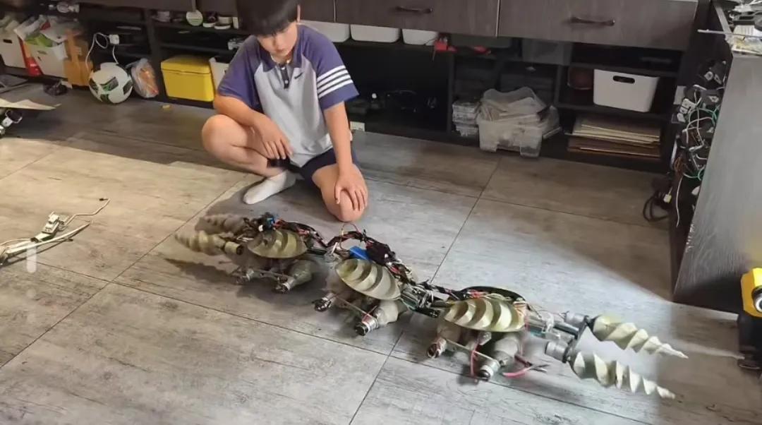 一开始,父子俩经常光顾幼儿园旁的玩具店,是那里的“大客户”。但随着小懿慢慢长大,普通玩具已经无法满足他的需求,再加上妻子邓嫚觉得玩具开销太大,姚聪便带着儿子研究起了小成本手工。矿泉水瓶、碎木片、铁丝、钉子 ……这些生活中随处可见的小物件,在父子俩的手中“摇身一变”,成了一件件颇具巧思的机械玩具。不仅如此,姚聪还教小懿玩编程、操作3D打印机,让孩子接触到更前沿的科技知识。