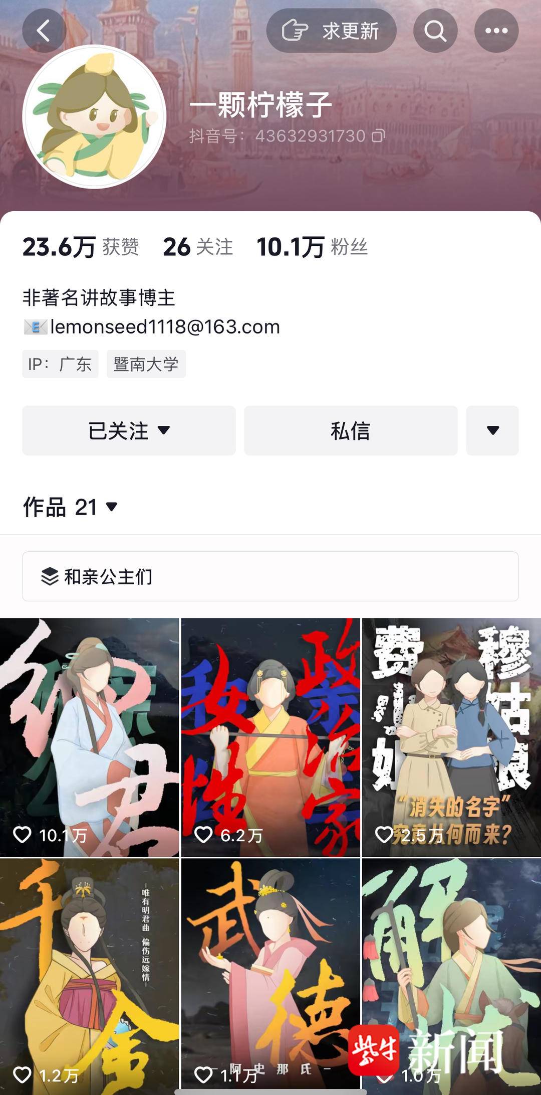 在尝试多个领域后,她终于定下了自己的创作方向——历史故事科普类内容。“我偶然读到一本关于宋代民间科普的书,萌生了做成视频的想法。”2024年6月,她在抖音发布了自己的第一条历史科普视频,运用人物立绘与历史文献制成动画,生动呈现宋代打工人生活日常。此后,她又以“牛郎织女传说真相”“费小姐和穆姑娘”“和亲公主”等为主题,聚焦历史中的女性故事,深入挖掘她们的生命轨迹。在“一颗柠檬子”的视频中,那些曾经只存在于书页间的女性,都化身为有着喜怒哀乐的鲜活个体。