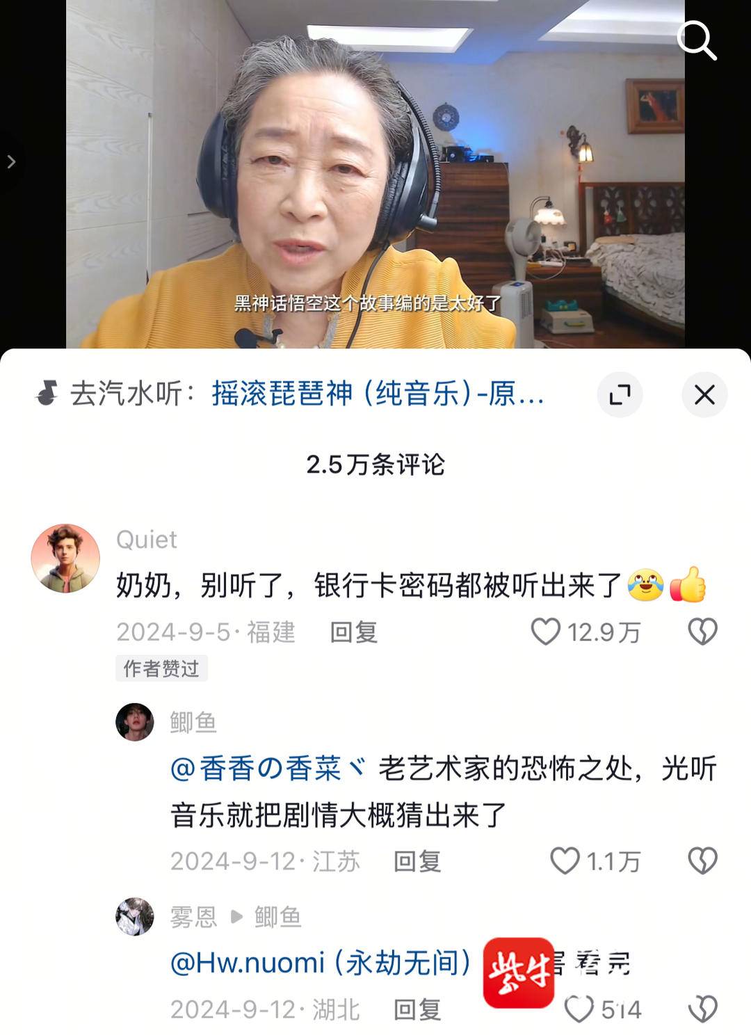 “钢琴奶奶”最早“火”起来的视频,是赏析游戏《原神》的配乐《神女劈观》。随后,尹松又赏析了《黑神话:悟空》《荒野大镖客》《明日方舟》等多部ACG作品中的音乐。没玩过游戏、没看过动画,仅凭音乐中的线索,尹松便能展开想象,分析出场景和人物形象,甚至猜出剧情。弹幕里常常飘过这样的评价:“奶奶的耳机戴出了听诊器的感觉”“我的银行卡密码都被听出来了”“如果音乐课能这样上就好了”……