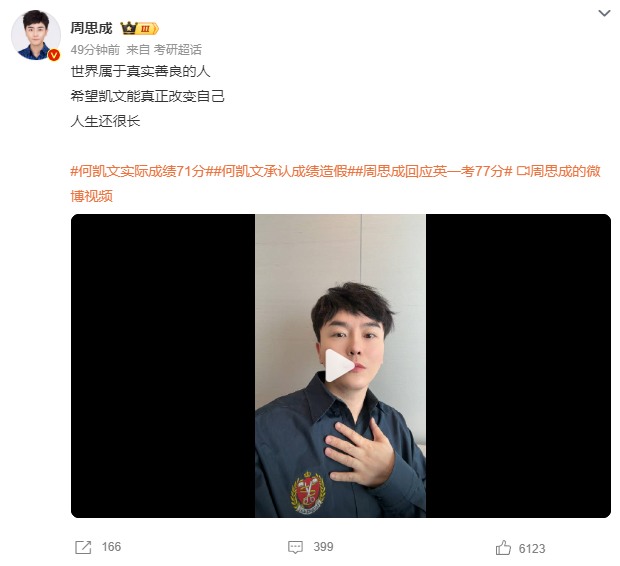 3月8日,何凯文发文道歉,称实际成绩为71分,此前发布的89分成绩确系虚假成绩。随后,周思成发视频回应何凯文道歉,并写道“世界属于真实善良的人,希望凯文能真正改变自己,人生还很长!