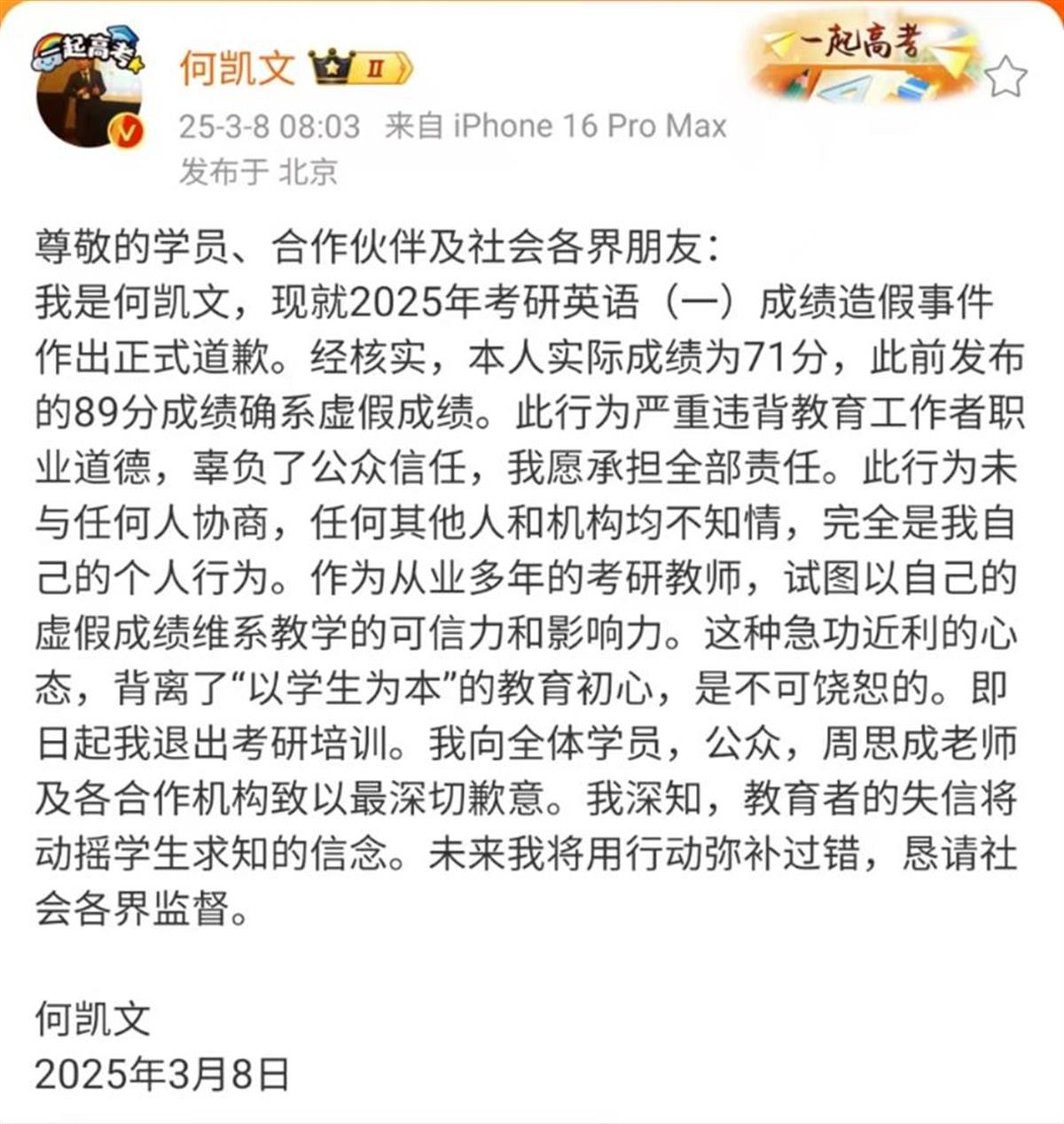 3月8日上午,何凯文发文道歉:“我是何凯文,现就2025年考研英语(一)成绩造假事件作出正式道歉。经核实,本人实际成绩为71分,此前发布的89分成绩确系虚假成绩。此行为严重违背教育工作者职业道德,辜负了公众信任,我愿承担全部责任。此行为未与任何人协商,任何其他人和机构均不知情,完全是我自己的个人行为。作为从业多年的考研教师,试图以自己的虚假成绩维系教学的可信力和影响力。这种急功近利的心态,背离了‘以学生为本’的教育初心,是不可饶恕的。即日起我退出考研培训。我向全体学员,公众,周思成老师及各合作机构致以最深切歉意。我深知,教育者的失信将动摇学生求知的信念。未来我将用行动弥补过错,恳请社会各界监督。”