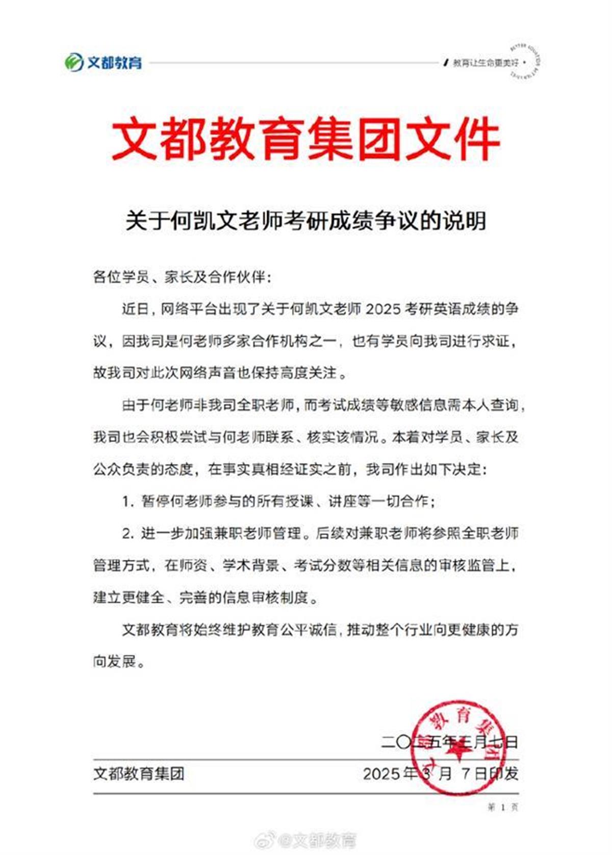 3月7日,何凯文合作机构之一文都教育集团发布说明称,由于何老师非公司全职老师,而考试成绩等敏感信息需本人查询,公司也会积极尝试与何老师联系、核实该情况。本着对学员、家长及公众负责的态度,在事实真相经证实之前,公司决定暂停何老师参与的所有授课、讲座等一切合作。