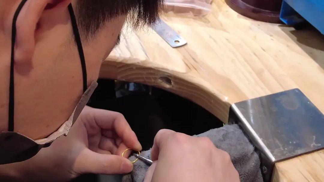 再取黄金进行焊接、打磨焊接口、水洗喷砂,一只1g重古法素圈就成型了!