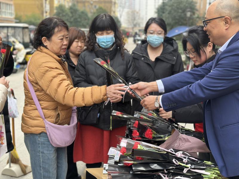 现场,有一些男士或小朋友也主动来领取鲜花,送给自己的爱人或妈妈。同时,工作人员还将鲜花送给了一些正在户外劳动的女性。