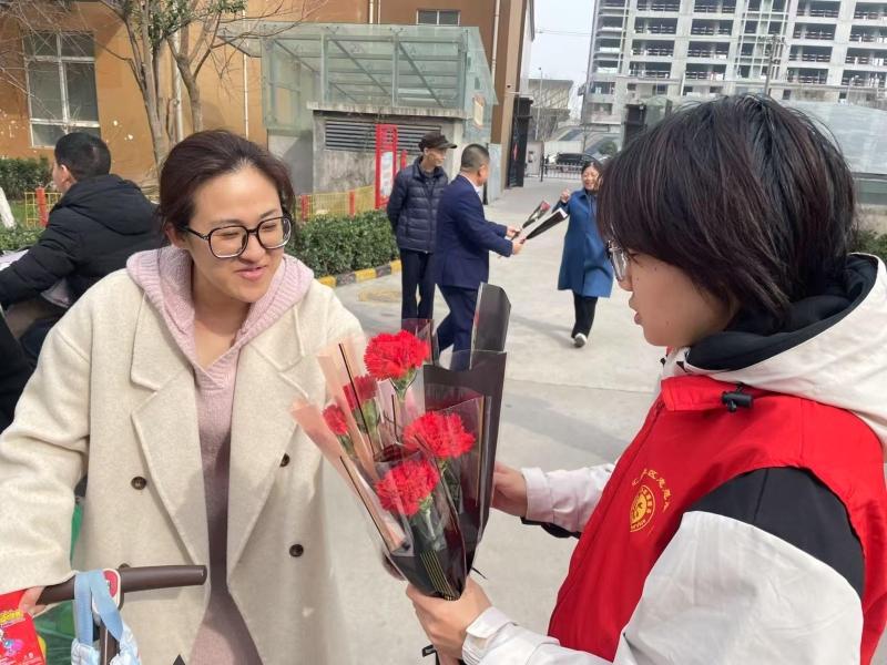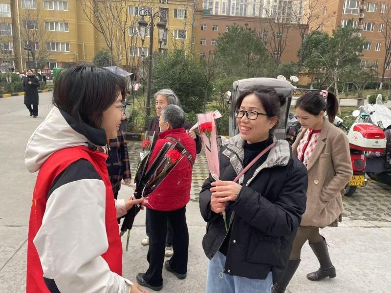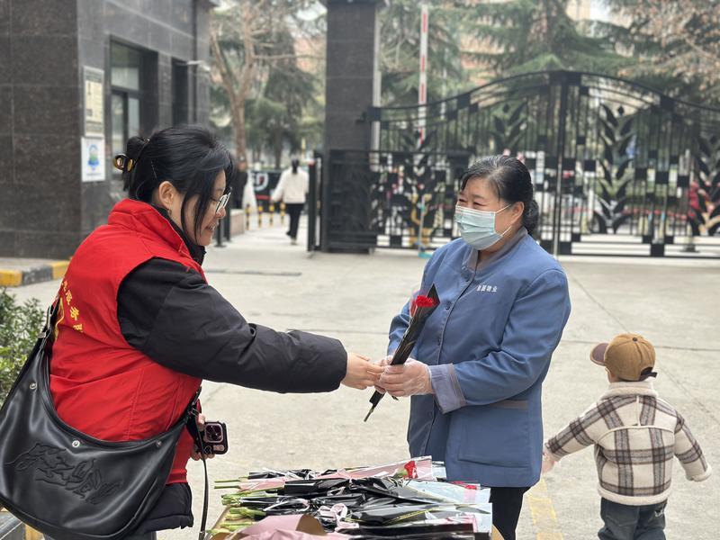 3月8日上午,雁塔区电子城街道汇成和苑小区门口一派温馨气氛,汇成社区工作人员及物业工作人员为来往女性随机派送鲜花,为她们带来一份浪漫惊喜。