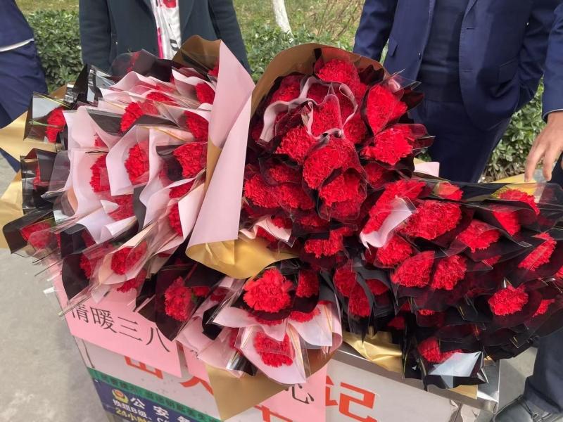 一大早,社区及物业工作人员将红色康乃馨精心包装起来,一朵朵鲜花散发着宜人的香气。正逢周末,不少居民来往于小区,工作人员将花束送给女性居民,并向她们送上了节日祝福。