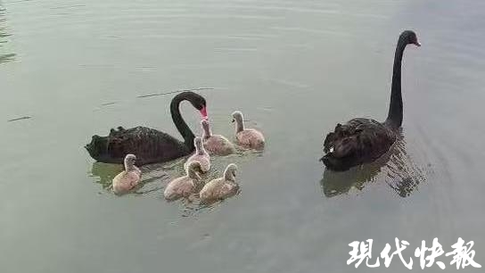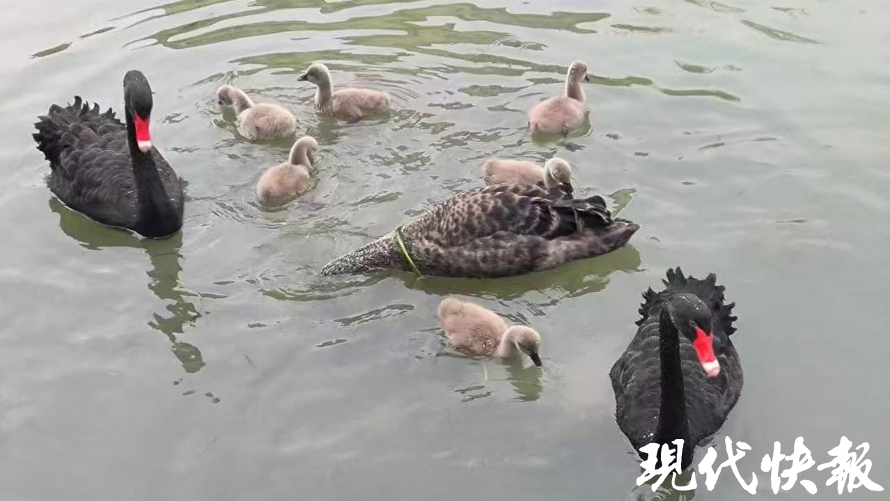现代快报讯(记者 顾潇)3月8日,现代快报记者在扬州瘦西湖景区看到了温馨一幕:一对黑天鹅夫妇领着6只萌趣可爱的天鹅宝宝在水中嬉戏。6只天鹅宝宝一身灰色绒毛,憨态可掬,在爸妈的悉心守护下,欢快游动,好奇地打量着外面的世界。