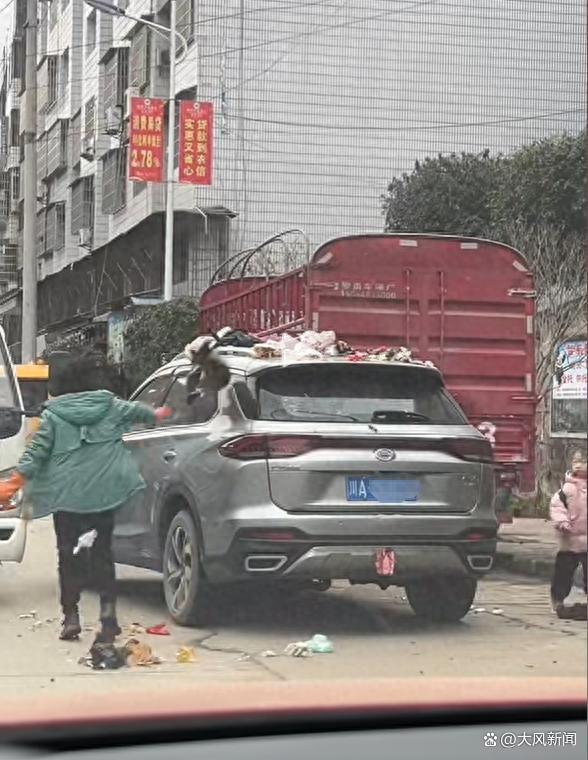 时长23秒现场视频显示,一名穿绿色工服的女环卫工驾驶一辆“川R××××”牌照的环卫车,疑因作业区被挡住影响收垃圾,女司机把黑色袋装垃圾直接甩到一辆灰色“川A××××4”牌照的私家车车顶,现场垃圾散落一地,环卫车司机随即上车离开。此举引得旁边的路人十分惊诧。