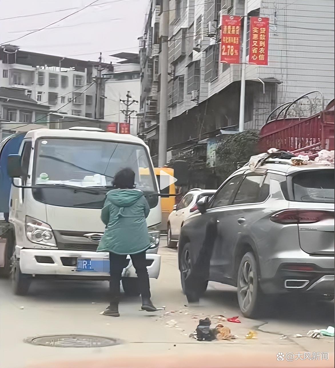 私家车疑挡住作业区,环卫女司机怒甩垃圾